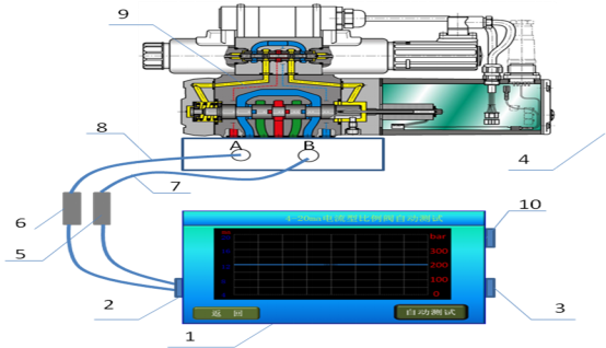 1、在線判斷液壓控制閥設(shè)備故障;在現(xiàn)代化的生產(chǎn)線包含有液壓控制閥的設(shè)備一旦出現(xiàn)故障,普通員工很難判斷是機(jī)械故障、液壓故障還是電氣控制故障;該儀器可解決上述問題,一步,斷開與液壓控制閥相連的電氣插頭,把本儀器配套的插頭插上,二步,將壓力傳感器的兩根測(cè)壓線連接到液壓控制閥的A、B口測(cè)壓點(diǎn)上,三步,打開本儀器電源,選擇與液壓控制閥相對(duì)應(yīng)的信號(hào),手動(dòng)測(cè)試即可判斷是機(jī)械故障、液壓故障還是電氣控制故障;如下圖: